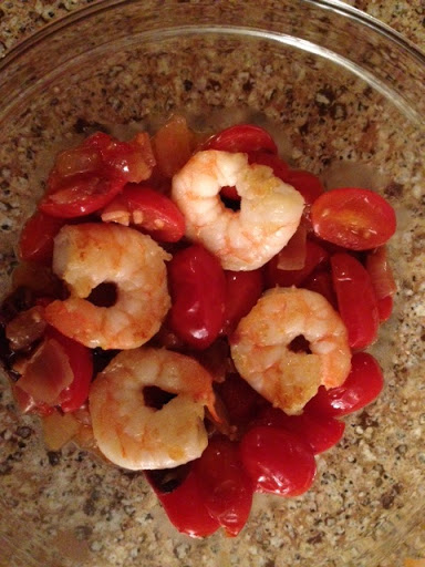 Heat 1 tablespoon olive oil in another skillet. Arrange the shrimp in one layer in the skillet and season. Cook until pink on both sides and just cooked through, 3 to 4 minutes. Arrange shrimp on a serving plate and spoon puttanesca sauce over and around the shrimp.