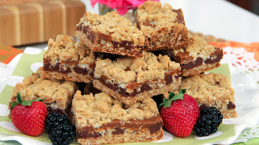 Remove from the oven and allow the slab to cool in the pan. Run a small knife along the two edges of the pan that do not have parchment handles. Carefully remove the slab from the pan and cut into approximately 2 - x 3 - inch bars. Make sure to use at least a 10-inch knife to avoid cutting and dragging the knife across the bars.