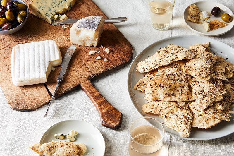 On fun stuff: That is, what gives your crackers character, makes them sing! Salt—both kosher or sea salt or whatever you like best in the dough and a coarse or flaky salt sprinkled over the top—is a must, as far as I’m concerned. (That said, if you’re watching your salt levels, DIY crackers a great option for you because you can totally control what goes in.) Everything else, both mixed right into the dough and sprinkled over the surface once rolled out? Up to you. That could mean: seeds—like sesame, pumpkin, sunflower, chia, poppy, flax; herbs—like rosemary or thyme, but stick to dried ones here; spices—like smoked paprika, garlic powder, cinnamon, dry mustard, fennel seeds (pound in a mortar and pestle until somewhat crushed before adding to the dough); cheese (must be relatively dry and easy to grate finely, like Parmesan, pecorino, or Gruyère).