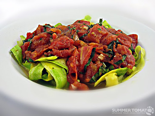 While the sauce is simmering, peel squash as shown in the video. Saute the squash ribbons in olive oil on medium heat. Sprinkle with salt and sauté for no more than 2 minutes. Do not allow them to brown or soften. Noodles should be brightly colored and al dente. Remove from pan and set aside.