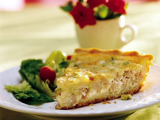 2. Sprinkle bacon, cheese and onions over crust. In medium bowl, beat half-and-half, eggs, salt and red pepper with spoon until blended. Pour into crust.