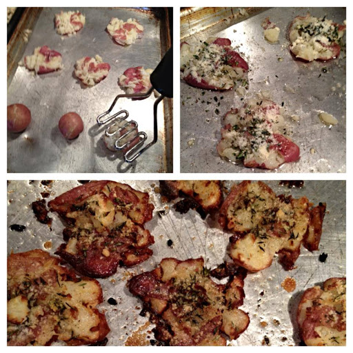 Boil some baby potatoes (I used red) until fork tender. Preheat oven to 450 degrees. Drizzle olive oil on a baking sheet, set potatoes on sheet and using a potato masher, gently smash each potato down, rotating masher both ways (so it looks like a thick cookie). Drizzle with olive oil, season with salt/pepper and sprinkle cut fresh herbs and garlic over each. THEN top with some lovely grated Parmesan cheese. Bake for 20 minutes.