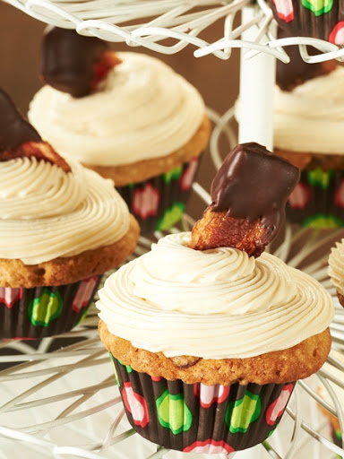 When ready to serve the cupcakes, frost them using an icing spatula or a piping bag fitted with a pastry tip. After frosting, place a piece of chocolate-covered bacon on each cupcake and serve.