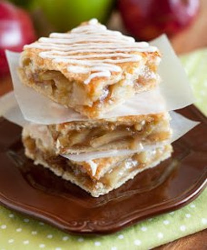 Divide pie dough into 2 equal portions. Roll one portion into a 13x9-inch rectangle on a lightly floured surface. Lift rolled dough into an ungreased 13x9 inch baking dish (the easiest way to do this is to fold the dough in half and then fold in half again, then transfer folded dough to one corner of the dish and unfold to it's original shape to cover entire baking dish). Toss apple mixture once more and pour into baking dish over pie crust. Roll remaining dough into a 13 1/2 x 9 1/2-inch rectangle and place rolled dough over apples (folding and unfolding as previously noted). In a small mixing bowl whisk egg white until foamy, brush egg white over top pie crust (you will only need about half of the egg white). In a separate small mixing bowl whisk together 1 1/2 tablespoon Raw Turbinado sugar with 1/4 teaspoon cinnamon. Sprinkle cinnamon sugar mixture evenly over top pie crust. Bake in preheated oven 50 to 60 minutes until golden brown and apples are tender when pierced with a toothpick. Remove from oven and allow to cool at least 30 minutes before cutting into squares. Drizzle with optional glaze or serve with vanilla ice cream. Store bars in refrigerator in an airtight container, rewarm in microwave if desired.