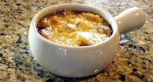 Meanwhile butter and toast both sides of bread under broiler. Then, pour soup into oven-proof soup crocks, float bread on soup, sprinkle cheeses on top and run under broiler until cheese is bubbly and lightly toasted.