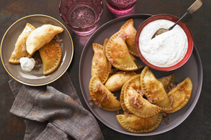 MIX remaining cream cheese, potatoes, onions and pepper until blended; set aside. Roll out dough on floured surface to 1/8-inch thickness; cut into 48 (3-1/2-inch) rounds, rerolling trimmings as necessary. Spoon 1 Tbsp. potato mixture onto center of each round. Brush water halfway around edge of each dough round; fold in half to enclose filling. Seal edges with fork.