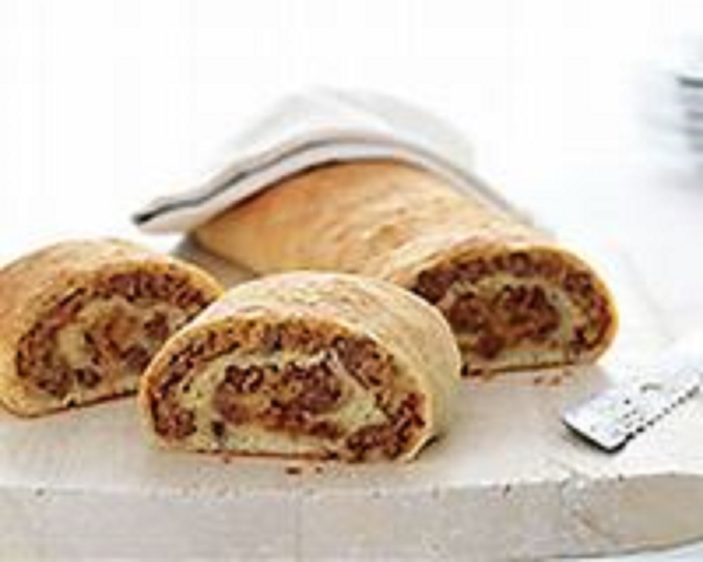 Unroll pizza dough onto baking sheet sprayed with cooking spray. Press into 15x8-inch rectangle; top with meat mixture. Roll up, starting at one long side. Rearrange if necessary so roll is seam side down.