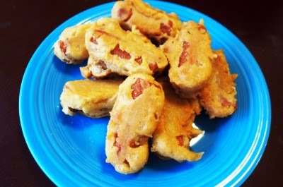 Dip the hot dog pieces into the batter to cover.