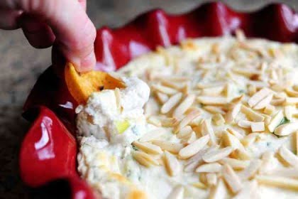 Place cream cheese and mayonnaise in a mixer fitted with a paddle attachment. Beat to combine. Add remaining ingredients except almonds and beat gently until just combined. Spoon into a heatproof baking dish. Sprinkle with slivered almonds, then bake at 375 degrees for 20 to 25 minutes or until golden and bubbly on top. Serve with corn chips or crackers.