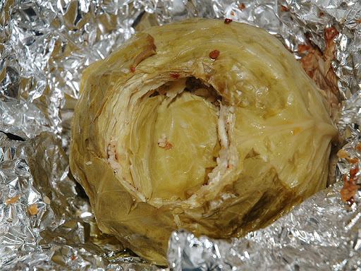 3. Wrap cabbage in foil, leaving an opening at top. Smoke 3 to 4 hours until tender.