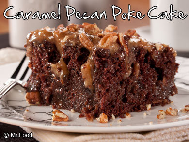 Cover and refrigerate 8 hours, or overnight. Spread frosting over cake, sprinkle with pecans, and serve.