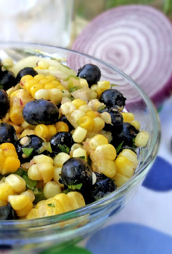 2. In a serving bowl combine corn, blueberries, cucumber, red onion, cilantro, and jalapeno. In a screw-top jar (I used a water bottle) combine lime juice, oil, honey, cumin, and 1/2 tsp. garlic salt. Cover; shake well to combine. Add to salad; toss. Cover and refrigerate overnight (up to 24 hours). Makes 6 to 8 servings.