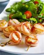 2. Season scallops with salt and pepper. Wrap a piece of bacon around each scallp and secure ends with toothpick.