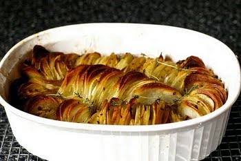 Preheat oven to 375 degrees. In a small bowl, combine butter and oil. With a sharp knife or manoline, slice potatoes crosswise very thinly. Figure out what baking dish you’d like to use [see Note above]; Martha suggests a 9-inch round baking dish (a deep dish pie pan would fit this bill) though I think you could go an inch bigger, an oval 1 1/2 to 2 quart casserole dish might also be pretty.