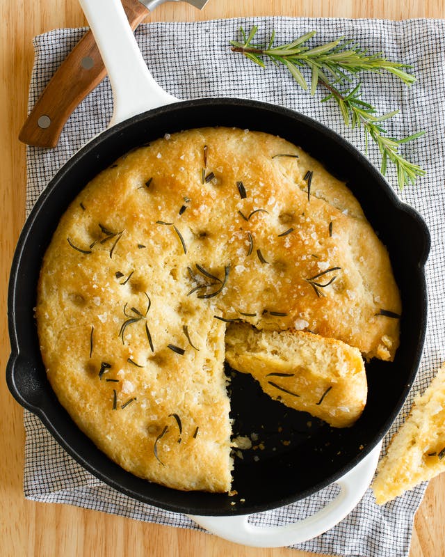 Topping options: There is tons of experimentation to be had when it comes to focaccia toppings. Aside from rosemary, other herbs like thyme and oregano, thinly sliced lemons, pitted chopped olives, thick slices of fresh garlic or shallots, a sprinkling of Parmesan cheese, and even everything bagel seasoning are great topping options.