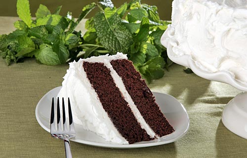 2. Assemble the cake: Put 1 cake layer, top side down, on serving plate. Cover the exposed surface with about 2 cups frosting, and spread the frosting evenly over the top of the cake to make the filling. Place the second cake layer on top of the frosting and frost the sides and top with the remaining frosting.