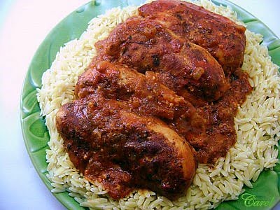 Return the chicken to the pan. The liquid should cover about 3/4 of the chicken pieces. Cover the pot and simmer over medium-high heat for about 30 to 40 minutes, or until the chicken is tender and thoroughly cooked. If the sauce becomes too thick, it can be thinned with a little more water. Season the finished sauce with kosher salt and pepper to taste. Serve over orzo, cooked according to package directions, and sprinkle Parmesan cheese on top.