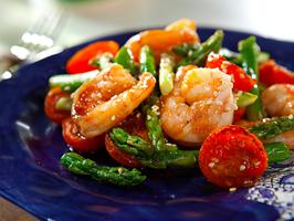 In the same skillet, heat the vegetable oil over medium-high heat until hot. Add the asparagus and cook until tender-crisp, stirring frequently, about 5 minutes. Add the tomatoes and cook 2 minutes, stirring frequently. Stir the soy sauce mixture and shrimp into the asparagus mixture. Cook 1 minute to heat through. Remove the skillet from the heat, and stir in the sesame oil.