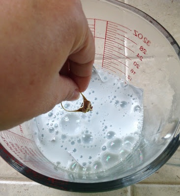3 Pour hot water into bowl. Place salt, soda, and dishwashing liquid into bowl. Place jewelry on top of foil and let it sit for 5 to 10 minutes. Rinse jewelry in cool water and dry jewelry completely with soft cloth. Discard solution after use and make a new batch next time.