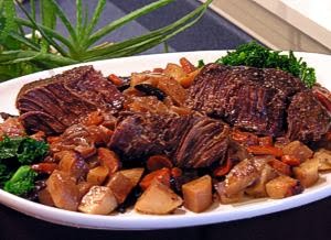 Remove roast to rest of platter. Turn crock pot to high. Whisk cornstarch into juices to thicken, this makes a wonderfully tasty au jus (or over mashed potatoes).