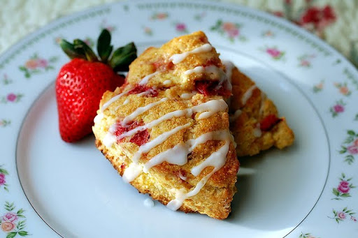 In a medium mixing bowl, sift together flour, baking powder and salt; whisk in cornmeal until combined. Knead in butter using fingertips or forks until well incorporated and mixture starts to clump together and form pea-size lumps. Stir buttery-flour mixture into corn mixture until just combined. Stir in strawberries until just combined. Chill dough in refrigerator or freezer until firm - about 20 minutes.