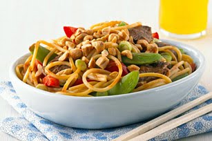 MEANWHILE, heat dressing in large skillet on medium-high heat. Add meat; stir-fry 3 min. or until meat is medium doneness. Add peanut butter and soy sauce; stir-fry 1 min. or until sauce is thickened.