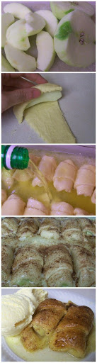 Peel and core apples. Cut apples into 8 slices each. Roll each apple slice in a crescent roll. Place in a 9 x 13 buttered pan. Melt butter, then add sugar and barely stir. Add vanilla, stir, and pour over apples. Pour Mountain Dew around the edges of the pan. Sprinkle with cinnamon and bake at 350 degrees for 40 minutes. Serve with ice cream, and spoon some of the sweet sauces from the pan over the top.