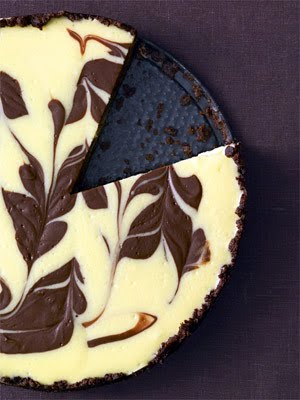 Stir the melted chocolate into reserved 1 cup filling. Spoon in dollops, evenly spaced, over top of the filling. With the tip of a small knife, swirl chocolate dollops into white batter to marbleize. Place cake pan in large roasting pan on oven rack. Pour enough boiling water into the roasting pan to come halfway up the side of the springform pan.