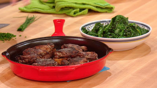 In second skillet, heat 1 tablespoon olive oil, a turn of the pan, add spinach or chard and wilt, season with salt, pepper and nutmeg.