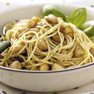Blend pasta and lemon peel. Arrange on serving platter. Top with scallop mixture.
