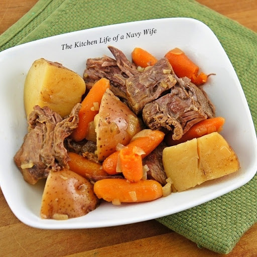 2. Place the roast back in the pot and the add carrots and potatoes around the meat. Add the Onion Soup Mix to 2 cups of water and pour around the meat and veggies. (You want the liquid to cover about 3/4 of the roast, and to cover the veggies, but you don't want to submerge the meat completely).