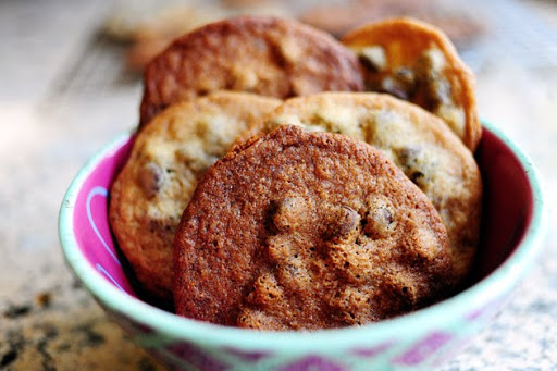 Drop by teaspoonfuls (or use a cookie scoop) and bake for 10 to 12 minutes. Bake less if you want chewy cookies; more if you want crispy cookies.