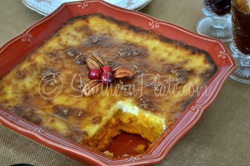 3.Using a measuring cup, gently scoop and pour custard over sweet potatoes.