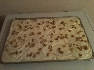 Heat oven to 325 degrees. Spray a 15"x10"x1" cake pan with baking spray with flour. In large mixing bowl, combine all ingredients except the walnuts. With an electric mixer, beat on low speed 30 seconds. Scrape the bowl and on medium speed, beat another 1 1/2 minutes. Stir in walnuts. Spread batter in pan. Bake for 24 minutes or until toothpick inserted in center comes out clean. Cool cake completely.