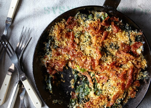 Transfer collard green mixture to a 10” cast-iron skillet or 9” pie dish and top with breadcrumb mixture; place pie dish on a rimmed baking sheet. Bake until gratin is bubbling, 15–20 minutes. Let cool slightly before serving.