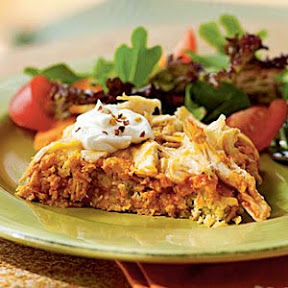 3. Bake at 400° for 15 minutes or until set. Pierce entire surface liberally with a fork; pour enchilada sauce over top. Top with chicken; sprinkle with remaining 3/4 cup cheese. Bake at 400° for 15 minutes or until cheese melts. Remove from oven; let stand 5 minutes. Cut into 8 pieces; top each serving with 1 tablespoon sour cream.