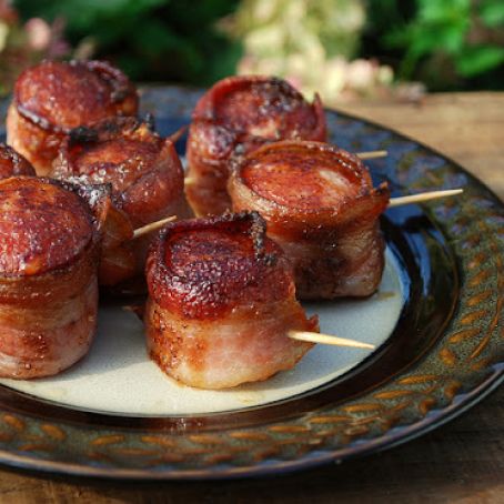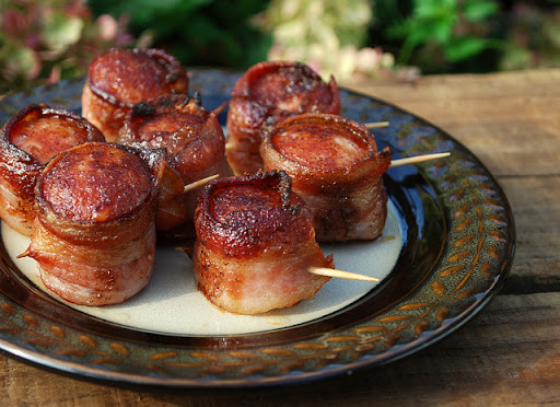 Cut the kielbasa into 1 inch pieces. Cut each slice of bacon in half. I used cutlery scissors and cut the whole package in half at once. Wrap each piece of bacon around the kielbasa, leaving a little room at the top so it can be filled. Secure with a toothpick. Place on the baking sheet.