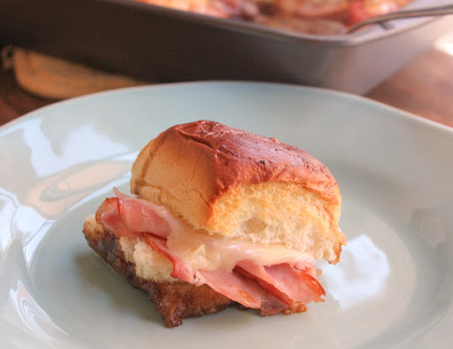 Layer bottom half with ham slices and cheese and place the top half back on.