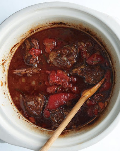 Transfer vegetables and liquid to slow cooker and add tomatoes, breaking them up as you go. Add herb sprigs; season to taste with salt and pepper. Cover and cook on high until meat is fork-tender, 6 hours.