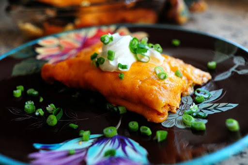 Using tongs, fry tortillas one at a time, for only about five to ten seconds per side (don’t allow to crisp.) Remove from oil, then dunk tortilla in enchilada sauce. Lay tortilla on a plate, then spoon a good two or three tablespoons of the sour cream mixture in the middle. Roll tortilla, then place face down in a 9 x 13 inch baking pan. Repeat with remaining tortillas and sour cream mixture.