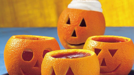 Cut "lid" from stem end of each orange; discard lids. With spoon or fingers, scoop and scrape out flesh from each orange to within 1/4 inch of peel, being careful not to puncture peel. Reserve orange flesh for another use. Place orange shells on cookie sheet or tray.
