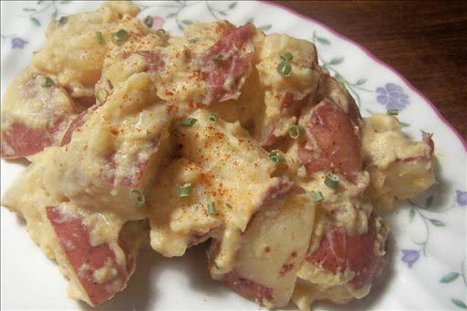 1 Place cubed potatoes in crock pot. 2 In a food processor or blender, puree the cottage cheese and sour cream until smooth. 3 Combine Velveeta, onion, garlic and salt with cottage cheese/sour cream blend, mix well. 4 Pour over potatoes and mix well. 5 Cover and cook on low for 5-6 hours or until potatoes are tender. 6 Stir before serving and garnish with paprika and chives.