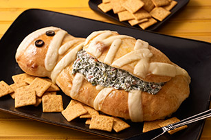 Use a sharp knife to remove bread from top of mummy's body; scoop out bread from center, leaving thin shell on bottom and side. (Reserve bread top. Discard removed bread or reserve for another use.) Fill bread with spinach dip just before serving; cover with top of bread. Serve with Wheat Thins for dipping.