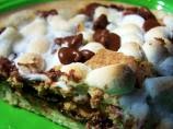 Remove the cookie from the oven and sprinkle the top with chocolate chips, graham crackers and marshmallows.