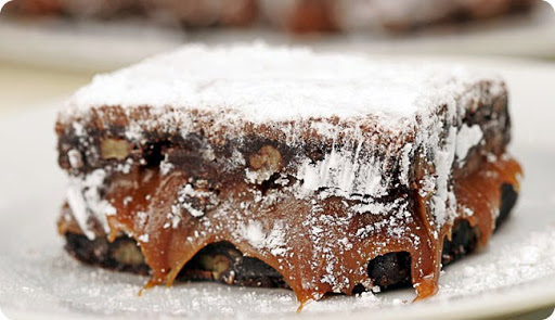 Bake for 20 to 25 minutes. Remove from pan and allow to cool to room temperature, then cover and refrigerate for several hours. When ready to serve, generously sift powdered sugar over the surface of the brownies. Cut into either nine or twelve helpings, and carefully remove from the pan.