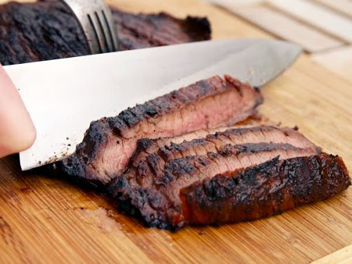 Remove steak from marinade and pat dry with paper towels. Ignite a large chimney full of coals and wait until they're covered in grey ash. Spread evenly over 1/2 of grate, leaving the other half empty. Put the cooking grate in place, cover, and allow grill to preheat for 5 minutes. Scrape cooking grates clean, then place flank steak over hot side of grill. cook until well charred, about 3 minutes. Flip steak and continue to cook until second side is well charred, about 3 minutes longer. Transfer steak to cooler side of grill, cover, and cook until the center of the steak registers 125°F on an intant-read thermometer for medium-rare, or 135° for medium. Transfer to a cutting board, tent with foil, and allow steak to rest for at least 5 minutes. Carve and serve, passing extra marinade tableside.