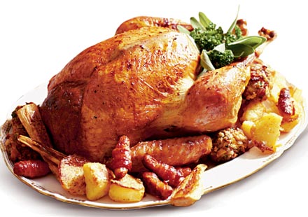 Place turkey in large roasting pan. Sprinkle cavity with salt and pepper, and stuff with onion, lemon, thyme, sage and celery