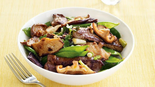 1. Sprinkle meat with salt and pepper. Heat oil in a large nonstick skillet over medium-high. Add ginger and mushrooms; stir-
