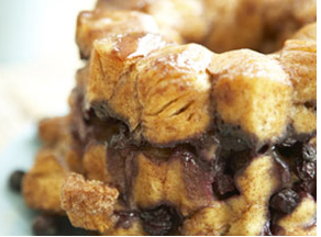 Repeat adding layers of biscuit pieces and blueberries until you reach the top of the pan.
