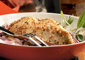 3. Add onions and garlic to an 8-9 inch skillet. Top vegetables with chicken, smooth side down. Cover lightly with foil and place in oven. Cook 15 minutes.